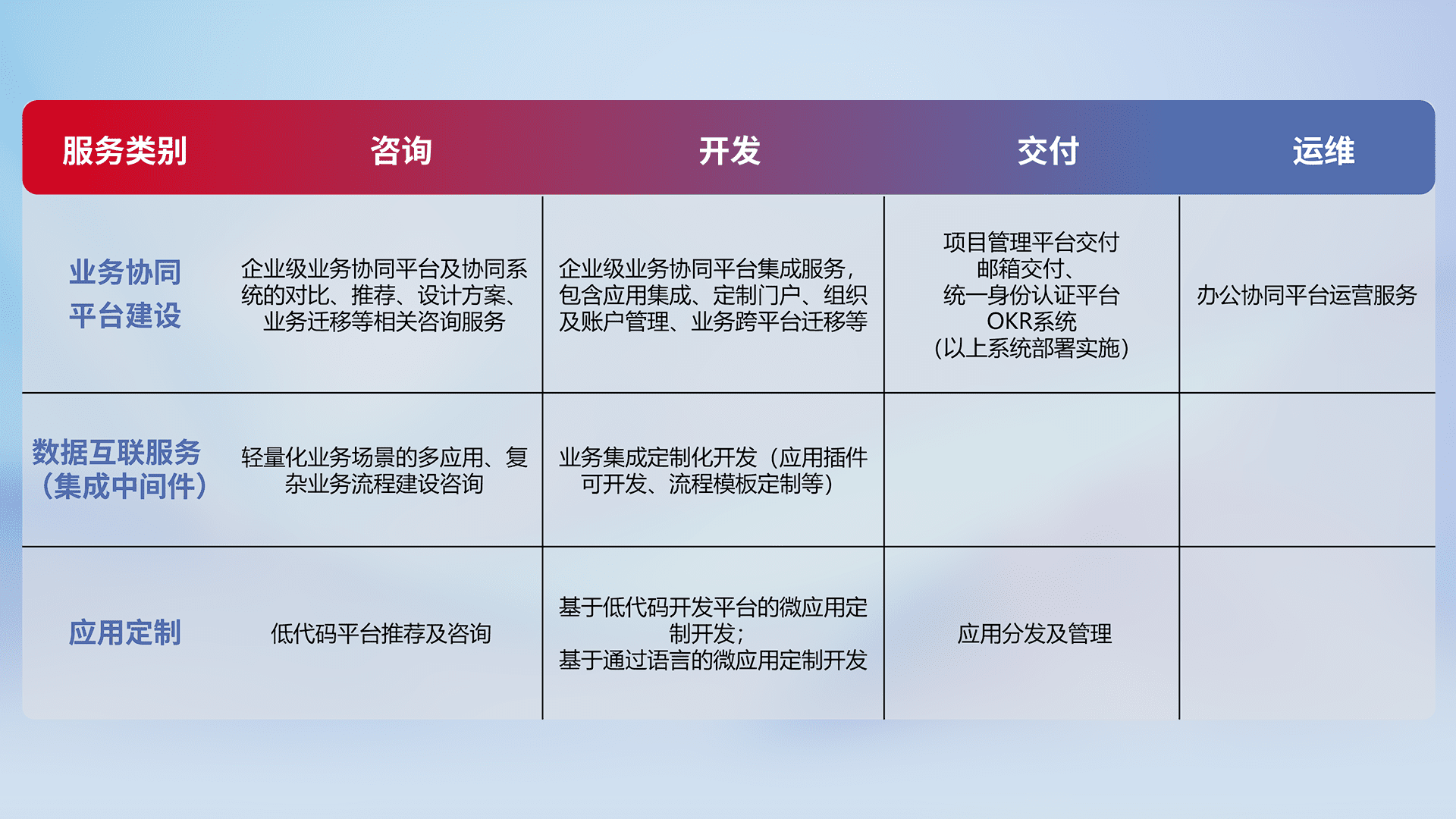 针对钉钉、、、、企微、、IDaas等平台级产品提供产品的规划、、、、方案、、、交付、、、定制化开发等服务,,,实现如统一协同办公、、、、智能客户服务、、、、混合会议管理、、、、智能数据查询、、、、等业务场景,,,实现数字化转型。。。