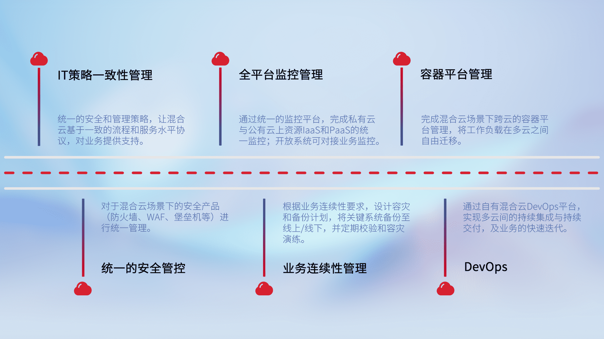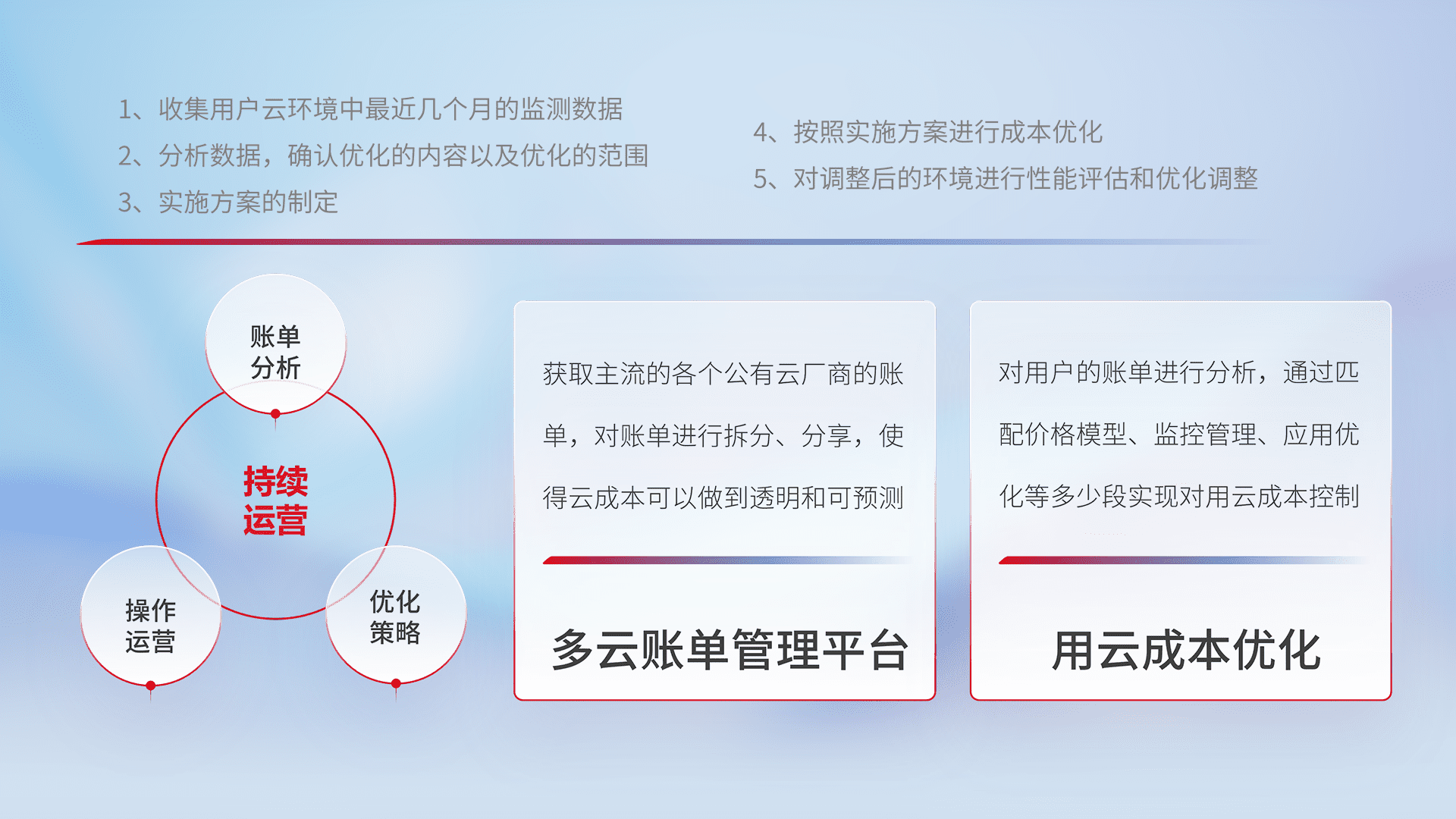 通过多云纳管,,以统一的资源数据模型把客户的云资源进行抽象和封装,,进而实现对多云资源的统一操作,,保障云资源管理的可靠性、、、、稳定性与可用性。。量身定制化运维内容,,,,配置、、开发运维、、、、补丁管理、、、、备份、、、、监控、、、认证和访问管理、、审计和日常巡检等,,保障在用云过程中的可靠度,,,稳定度以及高可用率。。。